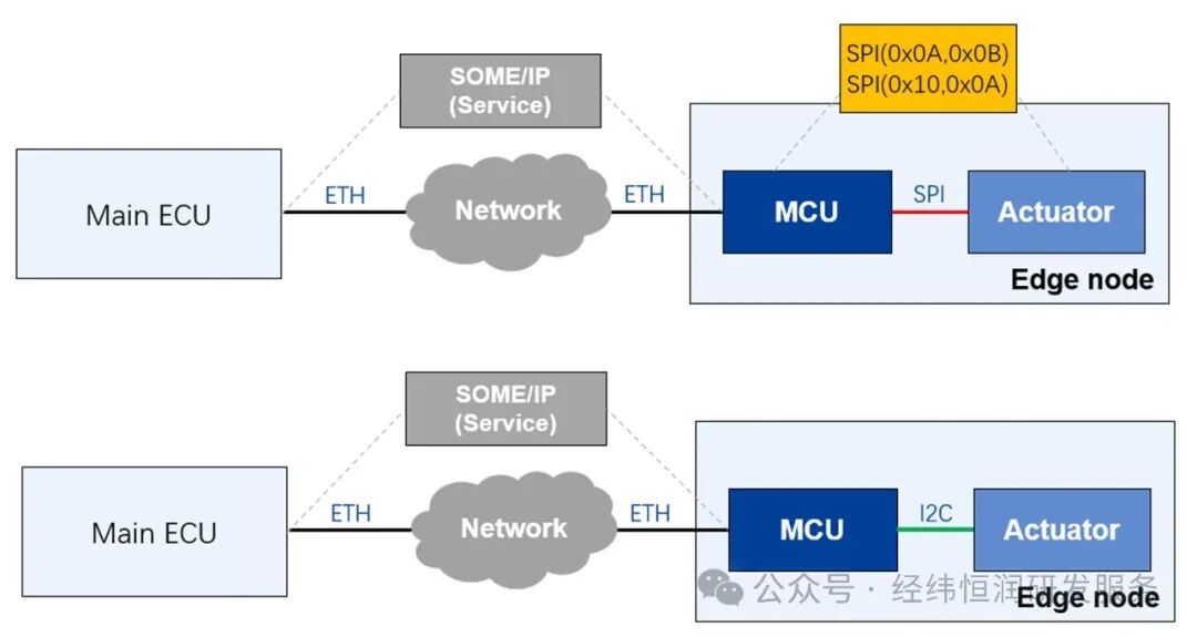 如果我们采用SOME/IP协议,信号的传输过程是这样的:区域控制器将SOME/IP报文发送至边缘节点,边缘节点中的MCU解析报文payload中控制执行器的信号,并通过SPI修改执行器的0x01寄存器。
