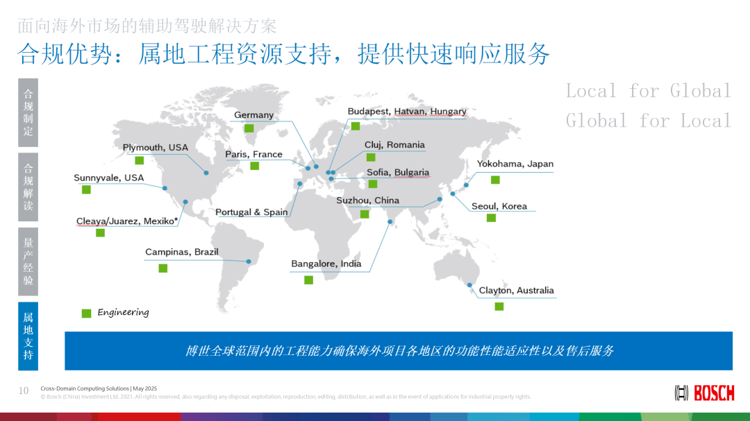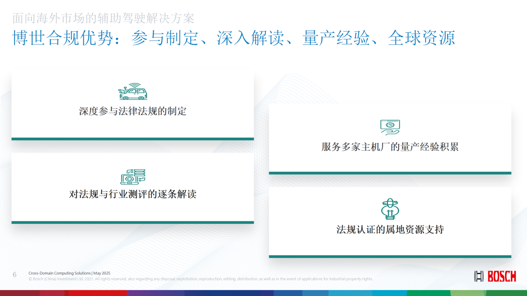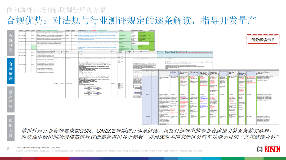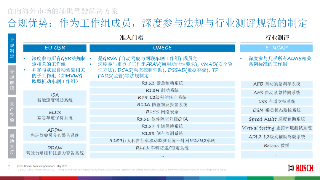 在智能驾驶领域,合规不仅是市场准入的前提,更是产品竞争力的重要保障。博世建立了完善的全球法规分析体系,将不同国家和地区的智能驾驶相关法律法规纳入统一框架,并进行逐条解析,评估其对产品设计、系统功能及测试认证的影响。这一体系不仅服务于欧洲市场,更为中国车企出海提供了关键支持,确保产品满足目标市场的法规要求。