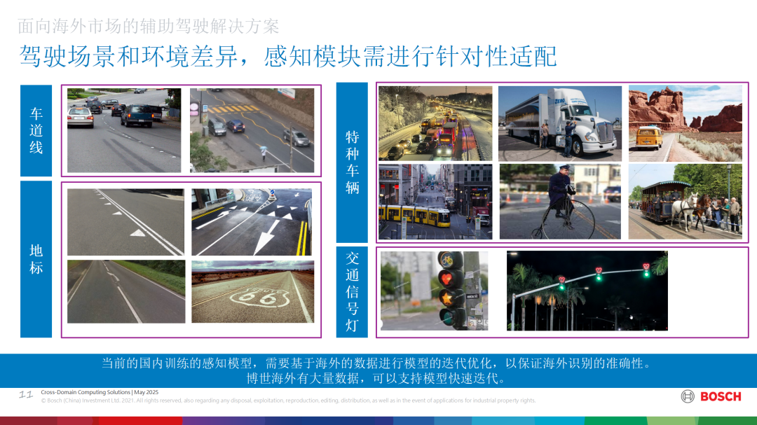 针对海外市场复杂的驾驶环境特点,博世建立了系统的场景差异化解决方案。在基础设施方面,重点解决特殊车道线、多语言路牌、异形地标等识别难题;在交通文化方面,深入研究不同地区的驾驶行为特征和交通规则差异;在特种车辆识别方面,开发了适应各国特殊车型的检测算法。这些针对性措施有效提升了系统在本地复杂场景下的适应能力。