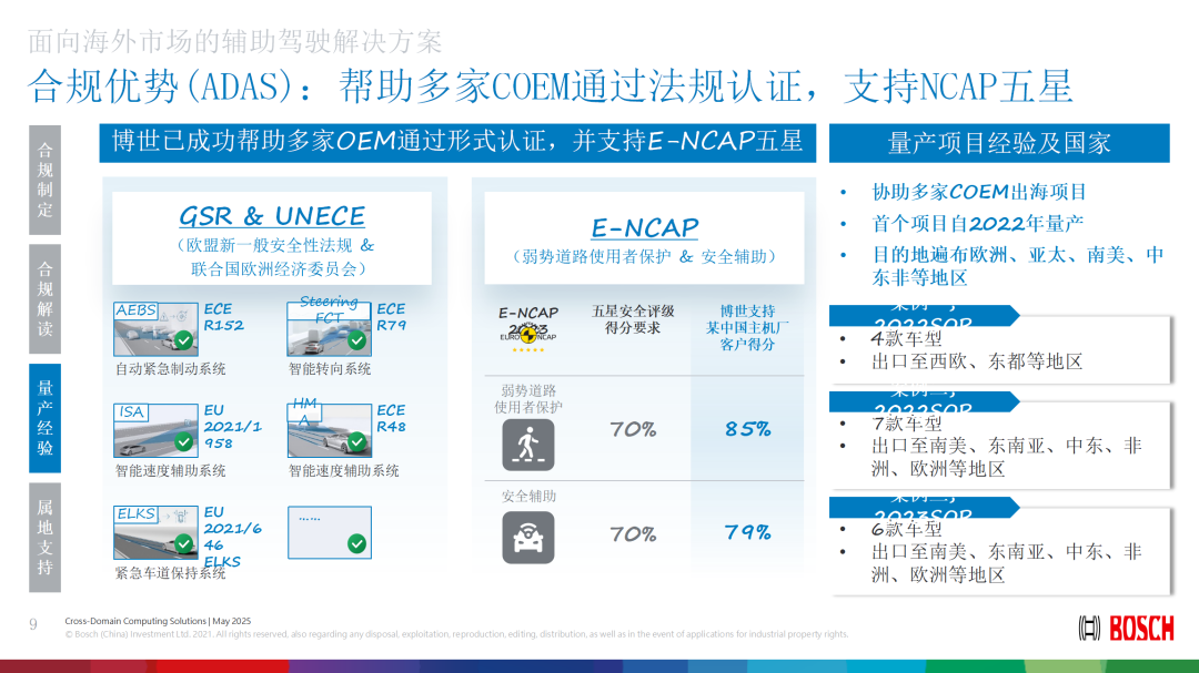 具体而言,在欧洲市场准入方面,博世全面掌握UN R152、R157、R158等关键法规要求。以GSR(通用安全法规)为例,公司不仅参与标准的制定,在相关法律法规发布之前深度参与法规的讨论环节,还承担着法规测试验证等重要工作,确保在产品开发初期就满足最新法规要求。